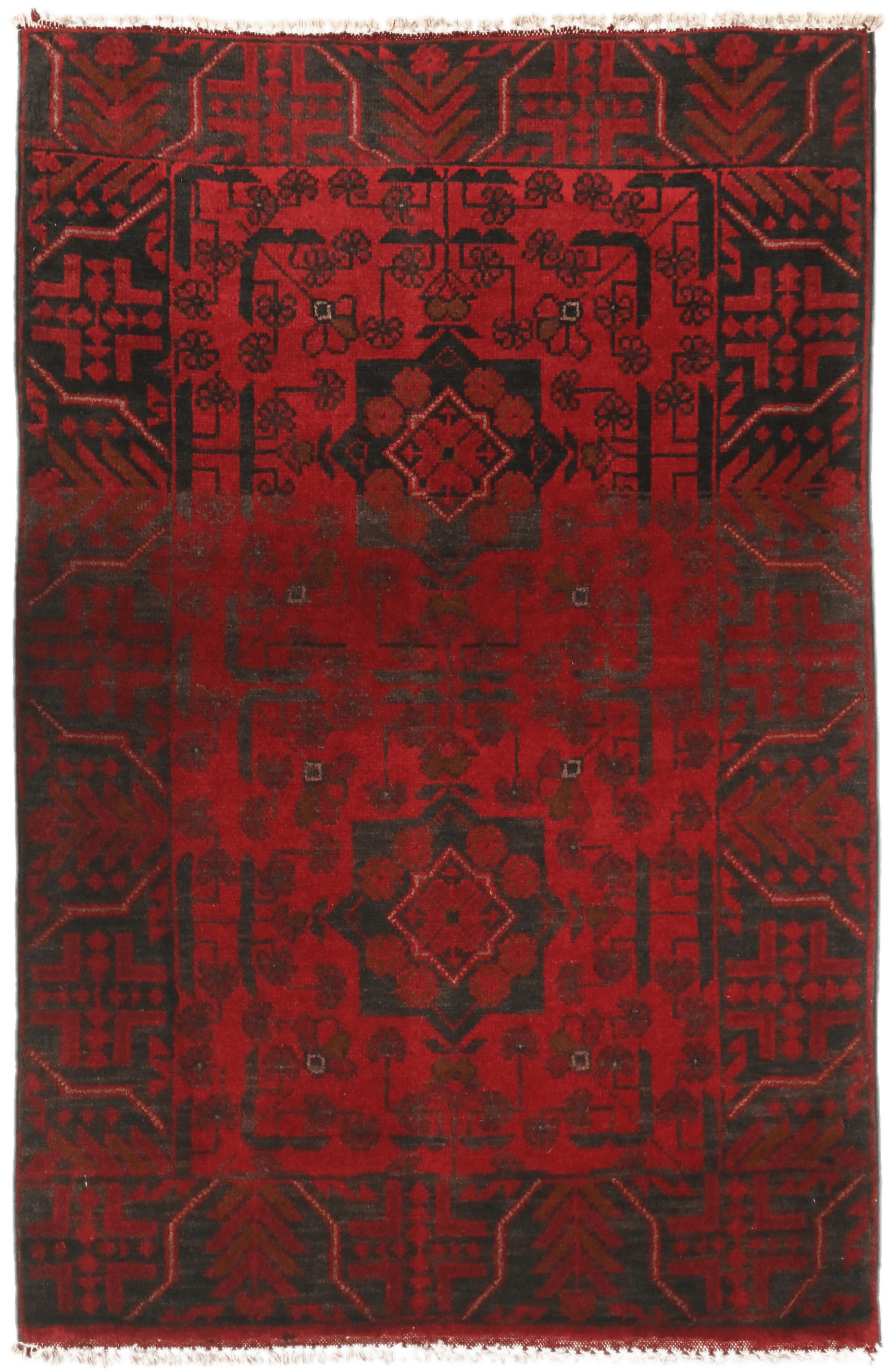 Khal Mohammadi rugs, named after the master dyer who developed the design, feature deep, warming, red tones, with black or navy patterning. They often feature repeated rectangular designs, with floral detailing. An incredibly warming design that will enliven your space!